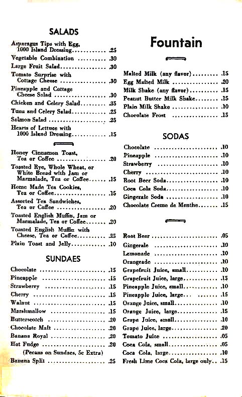 It was a treat to eat at a diner, especially those that offered curb service. Inside, there was usually a juke box and some places had small boxes at the booths. My "parents" were my grandparents whom I called Mom and Pop. Shopping with Mom was exciting for this little gal —we usually ate at the 5 & 10¢ stores: F.W. Woolworth's or McCrory's soda fountain. The sandwiches there were very good, even for a "picky" eater like myself. |